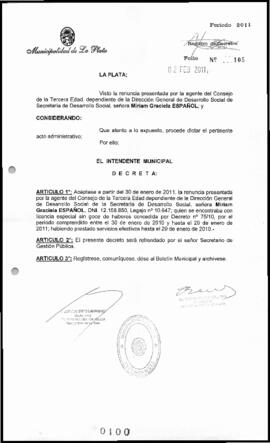 Acéptase a partir del 30 de enero de 2011, la renuncia presentada por la agente del Consejo de la Tercera Edad dependiente de la Dirección General de Desarrollo Social de la Secretaría de Desarrollo Social, señora Miriam Graciela ESPAÑOL, DNI. 12.158.850, Legajo n* 10.647; quien se encontraba con licencia especial sin goce de haberes concedida por Decreto n” 75/10, por el período comprendido entre el 30 de enero de 2010 y hasta el 29 de enero de 2011; habiendo prestado servicios efectivos hasta el 29 de enero de 2010.-
