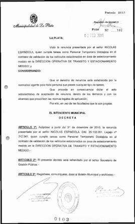 Acéptase a partir del 31 de diciembre de 2010, la renuncia presentada por el señor NICOLAS ESPINDOLA, DNI. 29.132.051, Legajo n* 312.541; quien cumple tareas como Personal Temporario Destajista en el contralor de validación de los vehículos estacionados en área de estacionamiento medido en la DIRECCION OPERATIVA DE TRANSITO Y ESTACIONAMIENTO MEDIDO.-