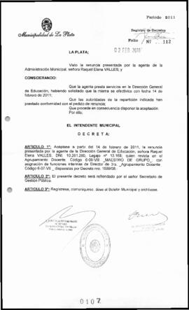 Acéptase a partir del 14 de febrero de 2011, la renuncia presentada por la agente de la Dirección General de Educación, señora Raquel Elena VALLES, DNI. 10.261.280, Legajo n° 13.169; quien revista en el Agrupamiento Docente, Código 6-09-VIII _MAESTRO DE GRUPO, con asignación de funciones interinas de Director de 3ra. Agrupamiento Docente Código 6-07-VII _ dispuestas por Decreto nro. 1599/08.-