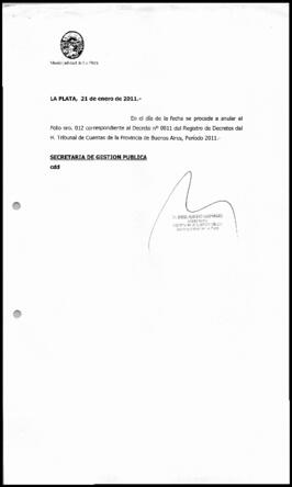 En el día de la fecha se procede a anular el Folio nro. 012 correspondiente al Decreto N° 0011 del Registro de Decretos del H. Tribunal de Cuentas de la Provincia de Buenos Aires, Período 2011.-
