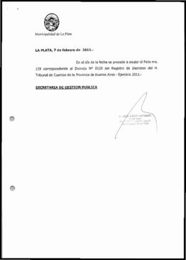 En el día de la fecha se procede a anular el Folio nro. 129 correspondiente al Decreto N9 0120 del Registro de Decretos del H. Tribunal de Cuentas de la Provincia de Buenos Aires - Ejercicio 2011.-