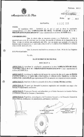 Apruébase la ampliación propuesta en la obra “AMPLIACIÓN DE DIAG. 73 ENTRE CALLE 41 Y 44 — PRESUPUESTO PARTICIPATIVO-”, cuya adjudicataria es la firma ALTOTE S.A.