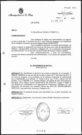 Rectifícase la situación de revista consignada en el Decreto n° 2504/10, mediante el cual se dispuso el cese a partir del 19 de enero de 2011, a los fines de acogerse a los beneficios de la jubilación ordinaria, de conformidad con lo establecido en el artículo 11”, inciso i) de la Ley 11757 y artículo 24 del Decreto —Ley n” 9650/80 (T.O. Decreto 600/94), del agente de esta Administración Municipal, señor Alberto Daniel LEONFORTE, MI. 8.464.547, Legajo n” 8069; la que deberá ser considerada en el Agrupamiento Profesional, Categoría 7A, con asignación de funciones con carácter interino de JEFE DE DEPARTAMENTO EDIFICIOS Agrupamiento Jerárquico, Categoría 09.-