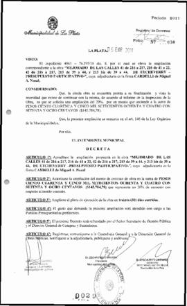 Apruébase la ampliación propuesta en la obra “MEJORADO DE LAS CALLES 41 de 216 a 217, 216 de 41 a 22, 42 de 216 a 217, 213 de 39 a 44, y 213 bis de 39 a 44, DE ETCHEVERRY -PRESUPUESTO PARTICIPATIVO-”, cuya adjudicataria es la firma CARDELLI de Miguel A. Nozal