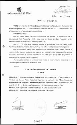 Declárese de Interés Cultural de la Municipalidad de La Plata, Capital de la Provincia de Buenos Aires, República Argentina, la realización del “Gran Encuentro Internacional de Jóvenes -Campamento Mundial Argentina 2011-”, a desarrollarse los días 11, 12, 13 y 14 de febrero año en curso en el Teatro Argentino de La Plata.