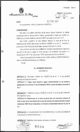 Modifícase el decreto nro. 400/2010 en su art. 1°, el que quedará redactado de la siguiente manera: “ARTICULO 1- Fíjase como importe a pagar voluntariamente en los términos establecidos en el artículo 7 de la Ordenanza 10672, la suma de pesos cincuenta ($ 50.-)”.