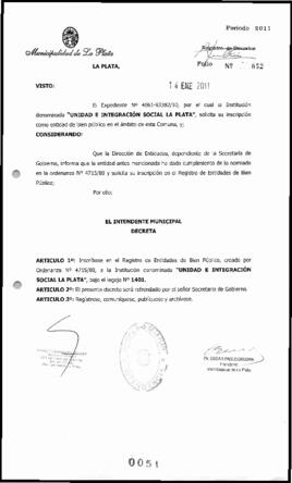 Inscríbase en el Registro de Entidades de Bien Público, creado por Ordenanza N° 4715/80, a la Institución denominada “UNIDAD E INTEGRACIÓN SOCIAL LA PLATA”, bajo el legajo N° 1401.
