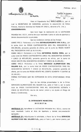 Apruébese la LICITACION PRIVADA Nro. 02/11, acerca de cuyo resultado ilustra el Acta de Apertura y demás documentación agregada.-