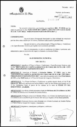 Apruébase el Pliego de Bases y Condiciones y Especificaciones Técnicas, para la obra “"EJECUCIÓN DE CARPETA ASFÁLTICA EN CALLE 446 DE 31 A 146 -CITY BELL- PRESUPUESTO PARTICIPATIVO 2011”.