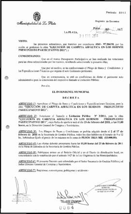 Apruébase el Pliego de Bases y Condiciones y Especificaciones Técnicas, para la obra “EJECUCIÓN DE CARPETA ASFÁLTICA EN LOS HORNOS PRESUPUESTO PARTICIPATIVO 2011”.