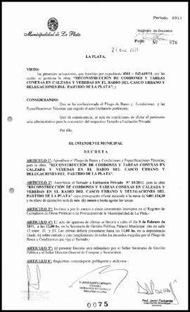 Apruébase el Pliego de Bases y Condiciones y Especificaciones Técnicas, para la obra “RECONSTRUCCIÓN DE CORDONES Y TAREAS CONEXAS EN CALZADA Y VEREDAS EN EL RADIO DEL CASCO URBANO Y DELEGACIONES DEL PARTIDO DE LA PLATA”.