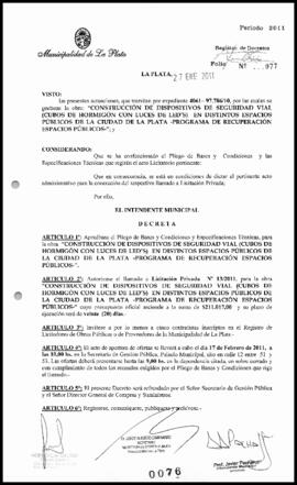 Apruébase el Pliego de Bases y Condiciones y Especificaciones Técnicas, para la obra “CONSTRUCCIÓN DE DISPOSITIVOS DE SEGURIDAD VIAL (CUBOS DE HORMIGÓN CON LUCES DE LED'S) EN DISTINTOS ESPACIOS PÚBLICOS DE LA CIUDAD DE LA PLATA -PROGRAMA DE RECUPERACIÓN ESPACIOS PÚBLICOS-”.