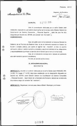 Acceder a la petición efectuada por el señor Daniel José VASQUEZ, DNI. 14.285.116, Legajo n° 14.003, dejándose establecido que la designación dispuesta por Decreto nro. 807/09, como Director General de Coordinación de Centros Comunales Personal Superior dependiente de la Secretaría de Gobierno; deberá ser considerada en el mismo cargo con carácter “ad - honorem”.-