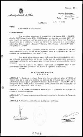 - , Sección P, Manzana 1268, Parcela 14, Partida N* 4209 de este partido de La Plata, a favor de la señora CLAI Julia Haydee, DNI 11.096.253 y el señor CIRONI Juan Carlos, DNI 4.628.620.