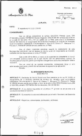 Declárase de Interés Social a los fines previstos en la Ley N°10.830, el otorgamiento de la escritura traslativa de dominio del inmueble cuya nomenclatura catastral es: Circunscripción III, Sección B, Chacra 77, Manzana 77-1, Parcela 21, Partida N9 256026 de este partido de La Plata, a favor de la señora SALCEDO Patricia Laura, DNI 27.629.596 y el señor ESPINOSA Ramón Alejandro, DNI 26.680.581.