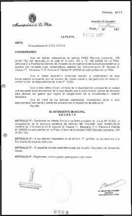 Declárase de Interés Social a los fines previstos en la Ley N° 10.830, el otorgamiento de la escritura traslativa de dominio del inmueble cuya nomenclatura catastral es: Circunscripción lIlI, Sección B, Chacra 77, Manzana 77-H, Parcela 4, Partida N9 255895 de este partido de La Plata, a favor de la señora PAEZ Marcela Leonarda, DNI 20.067.752.