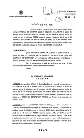 Expte. 4061-1149559-20. Aprueba Pliego. Llama a Licit. Pública Nº 05-20para la adquisición de bolsas de residuos.
