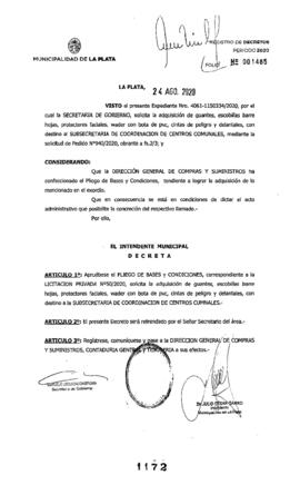 Expte. 4061-1150334-20. Aprueba Pliego Licitación Privada Nº 50-20 por la que se solicita la adquisición de guantes y otros.