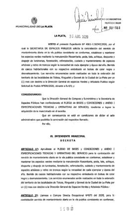 Expte. 4061-1150347-20. Aprueba Pliego. Llama a Compra Directa Excepcional Nº 875 por la que se solicita la contratación del servicio de mantenimiento diario en la vía pública en Tolosa Ringue.