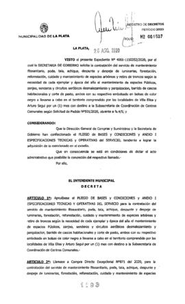 Expte. 4061-1150352-20. Aprueba Pliego. Llama a Compra Directa Excepcional Nº 871 por la que se solicita la contratación del servicio de mantenimiento fitosanitario en V. Elisa y A. Segui.