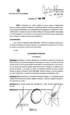 Acepta donación efectuada por el Ministerio de Salud de la Provincia de Buenos Aires de vehículos tipo Ambulancia con destino al SAME.