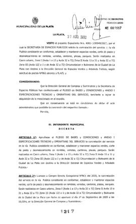 Expte. 4061-1150949-20. Aprueba Pliego. Llama a Compra Directa Excepcional Nº 901 mantenimiento en la vía pública en Casco urbano Zona I Zona II Zona III Circunvalación y Bulevares..
