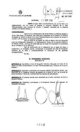 Expte. 4061-1115592-19 Alc. 3. Aprueba Acta de Recepción Definitiva de la Obra Retroexcavadora para limpieza de arroyos y.
