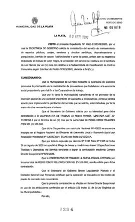 Expte. 4061-1150349-20. Adjudica Compra Directa Excepcional Nº 873 por la que se solicita la contratación del servicio de mantenimiento diario de espacios públicos en Los Hornos.