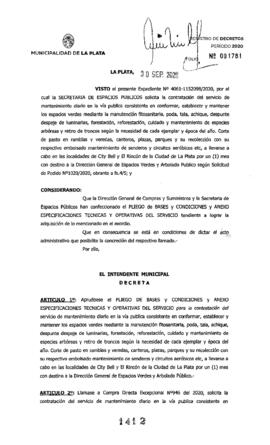 Expte. 4061-1152089-20. Aprueba Pliego. Llama a Compra Directa Excepcional Nº 946-20 por la que se solicita la contratación del servicio de mantenimiento diario en la via pública en City Bell y.