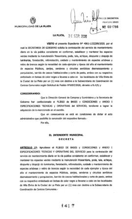 Expte. 4061-1152289-20. Aprueba Pliego. Llama a Compra Directa Excepcional Nº 957-20 por la que se solicita la contratación del servicio de mantenimiento diario en la via pública en V. Elvira.