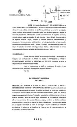 Expte. 4061-1152290-20. Aprueba Pliego. Llama a Compra Directa Excepcional Nº 958-20 por la que se solicita la contratación del servicio de mantenimiento diario en la via pública en Abasto y El.