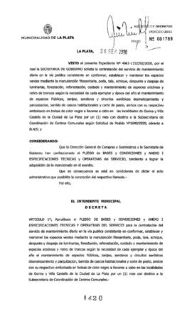 Expte. 4061-1152292-20. Aprueba Pliego. Llama a Compra Directa Excepcional Nº 960-20 por la que se solicita la contratación del servicio de mantenimiento diario en la via pública en Gorina y V..