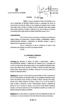 Expte. 4061-1152347-20. Aprueba Pliego. Llama a Compra Directa Excepcional Nº 965-20 alumbrado público en Ringuelet Gorina Gonnet V. Castells Savoia City Bell Los Porteños El Rincon V. E.