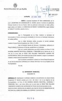 Expte. 4061-1185800-22. Adjudica Compra Directa Excepcional Nº 56 por la que se solicita el servicio de publicación en medio gráfico.