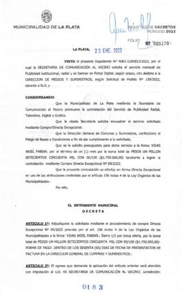 Expte. 4061-1185812-22. Adjudica Compra Directa Excepcional Nº 69 por la que se solicita la contratación del servicio de publicidad institucional radiel y en banner en portal digital.