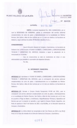 Expte. 4061-1160664-21. Aprueba Pliego. Llama a Compra Directa Excepcional Nº 100 por la que se solicita la contratación del servicio adicional complementario de corte de pasto y desmalezamient.