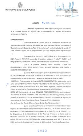 Expediente. 4061 2050215 24. Aprueba. Adjudica Licitacion. Privada Nº 98 24 para la contratación del Servicio de alquiler de escenario (Aniversario La Plata)