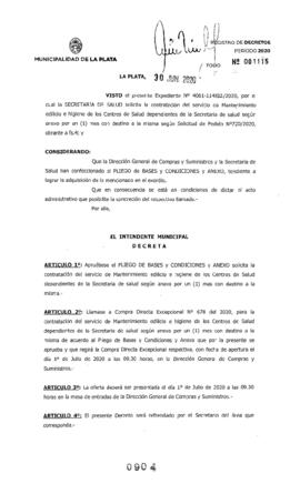 Expte. 4061-1148212-20. Aprueba Pliego. Llama a Compra Directa Excepcional Nº 678 por la que se solicita el servicio de mantenimiento edilicio e higiene de los Centros de Salud.