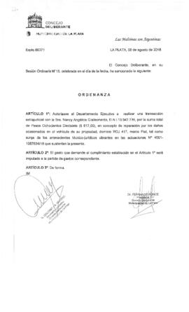 Autorizase al Departamento Ejecutivo a realizar una transacción extrajudicial con la Sra. Nancy Angélica Gialleonardo, D.N.1.13.942.736, por la suma total de Pesos Ochocientos Diecisiete ($ 817,00), en concepto de reparación por los daños ocasionados en el vehículo de su propiedad, dominio ROJ 417, marca Fiat, tal como surge de los antecedentes técnico-jurídicos obrantes en las actuaciones N? 4061- 1067634/18 que sustentan la presente.